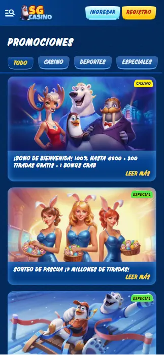 SG Casino no tiene aplicación nativa para iOS ni Android. La plataforma funciona completamente a través del navegador móvil con una versión responsiva que mantiene todas las funcionalidades: juegos, depósitos, retiros, bonos y soporte.