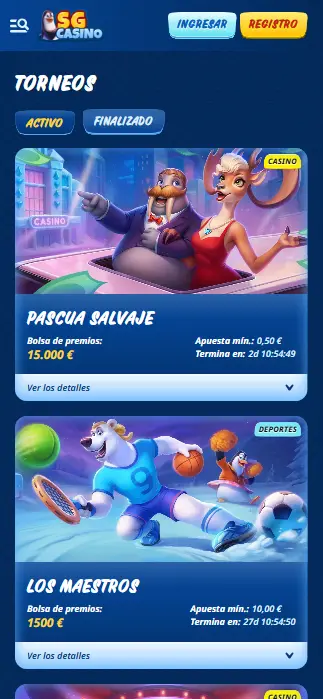SG Casino integra una sección de apuestas deportivas con más de 30 disciplinas, incluyendo fútbol, baloncesto, tenis, eSports y deportes virtuales con eventos 24 horas. Las apuestas en vivo están disponibles con cuotas actualizadas. Es una sección funcional y competente.