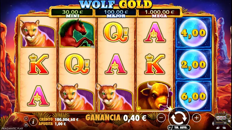 🔍 Ojo del Zorro: Los jackpots de Wolf Gold son fijos, no progresivos. El Mini siempre vale 30x, el Major 100x y el Mega 1.000x. No crecen con las apuestas de otros jugadores. Esto es diferente a los jackpots progresivos que ofrecen otros slots.