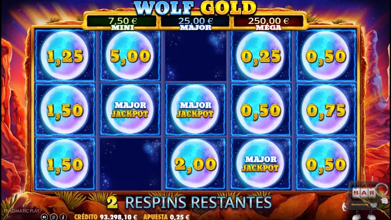 El Mega Jackpot solo se obtiene al llenar las 15 posiciones del tablero con lunas. Es un evento extremadamente raro, pero cuando ocurre, los valores de todas las lunas más el jackpot de 1.000x se suman para un premio que puede alcanzar los 2.500x.